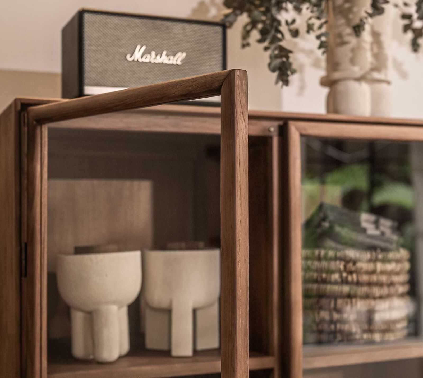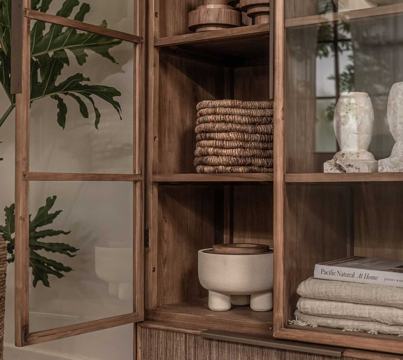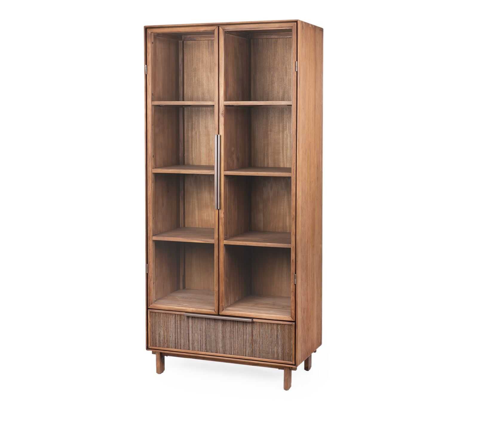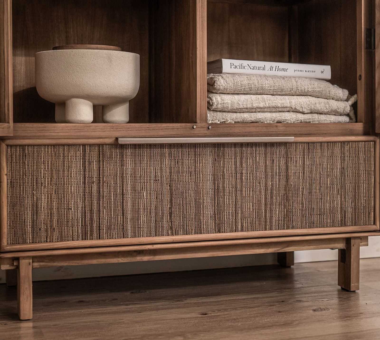 ארון ראטן עם ויטרינה, צר וגבוה מעץ טיק בשילוב דלתות זכוכית ומגירה עם חיפוי ארוג של עלי קוקוס.
