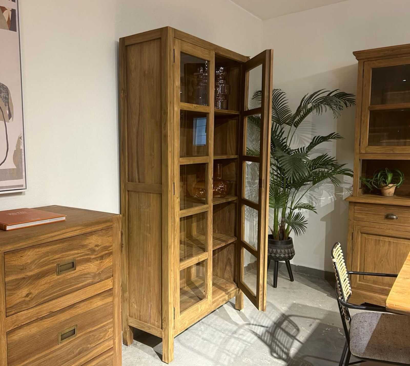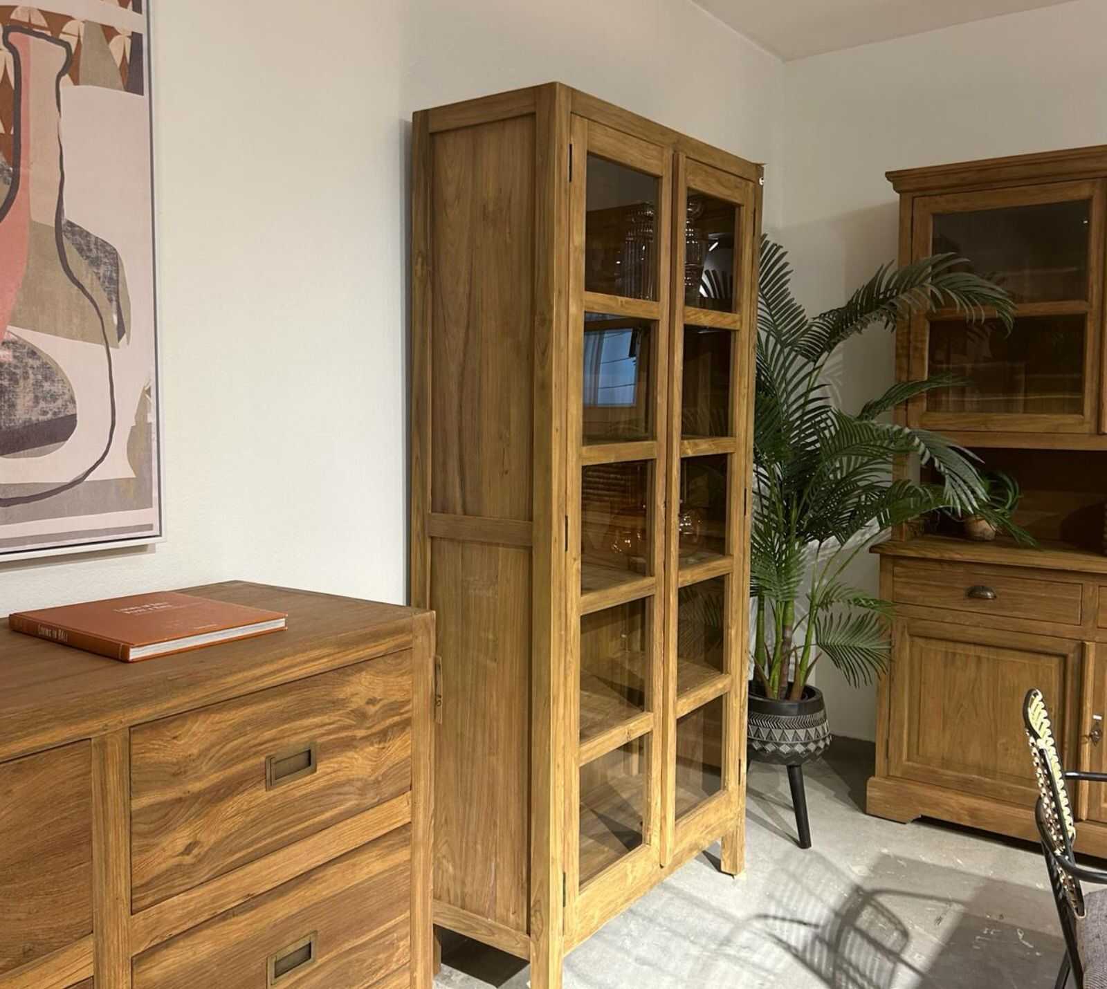 ויטרינה מעץ טקי ממוחזר עם דלתות זכוכית.
