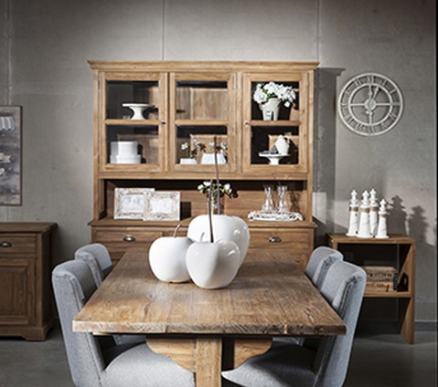 ויטרינה מעץ טיק ממוחזר מלא, מעוצבת עם מגירות וארונות אחסון. בנוי משני חלקים.