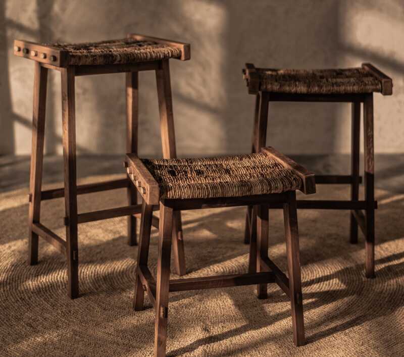 כסא בר מעץ טיק ומושב קלוע מסיבי אבקאה.