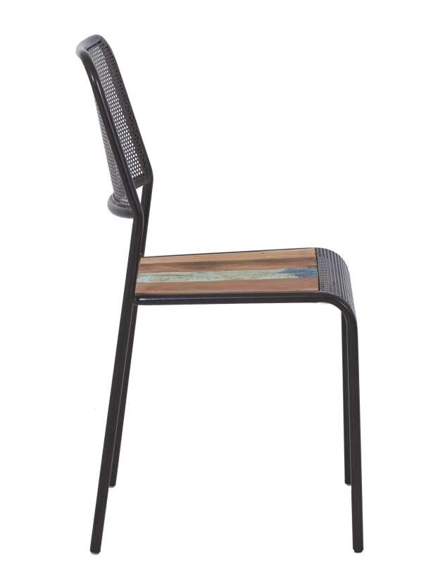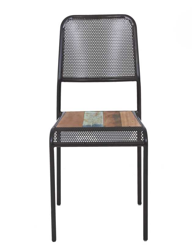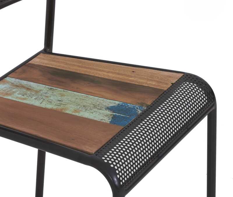 כיסא מתכת מעוצב עם מושב עשוי עץ ממוחזר.