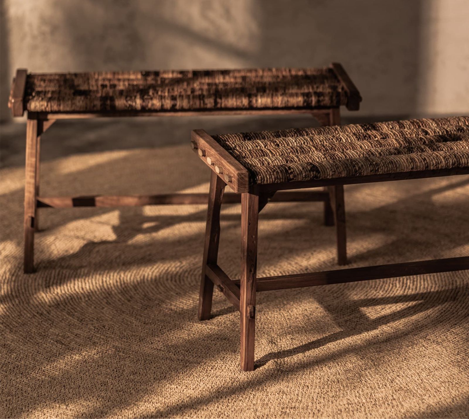 ספסל בעל מושב ארוג מסיבי עשוי מסגרת מעץ טיק וקליעת אבאקה בעבודת יד. מתאים לישיבה או כאביזר דקורטיבי להשלמת עיצוב החלל.