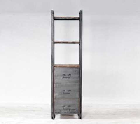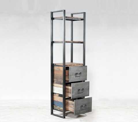 ספרית מדפים ומגירות בשילוב עץ ממוחזר וברזל
