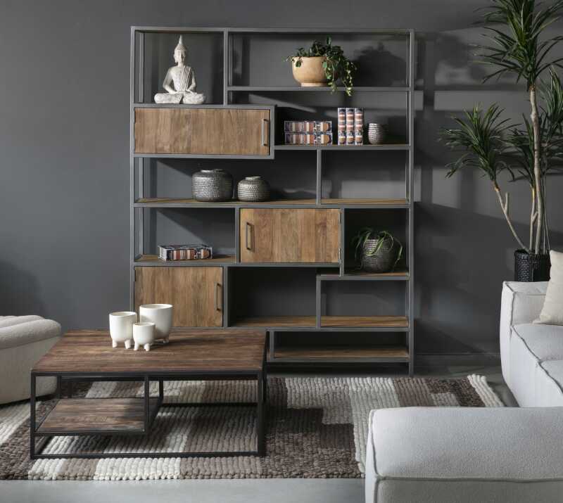 ספריה מעוצבת עשויה עץ טיק ממוחזר וברזל. מערכת מולטי מדפים בשילוב שולש דלתות עץ מלא.