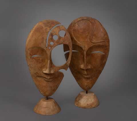 מסכות עץ מגולפות משורש עץ טיק – פריט מושלם להשלמת עיצוב הבית.