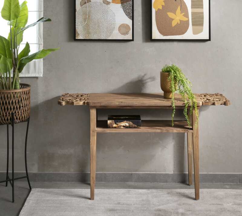 קונסולה מעץ טיק עם גילופים מסורתי של פרחים בצדים.