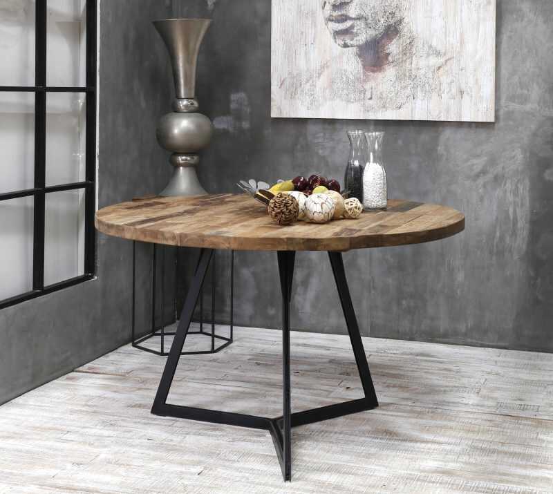 שולחן אוכל עגול בעל רגלי ברזל ופלטת עץ טיק מלא.