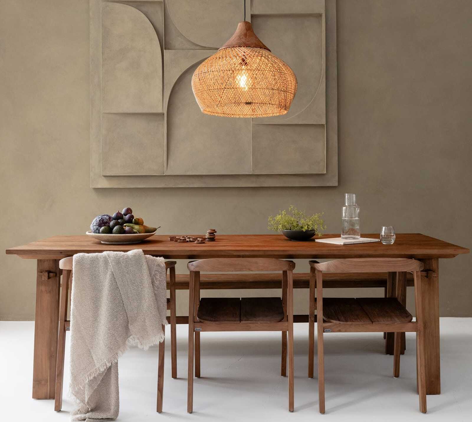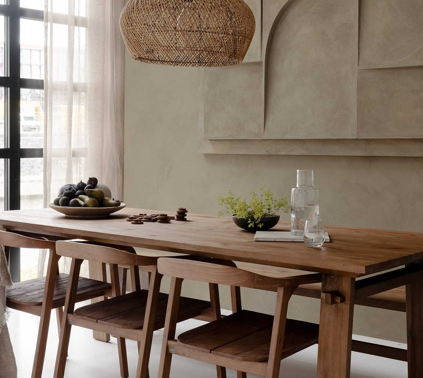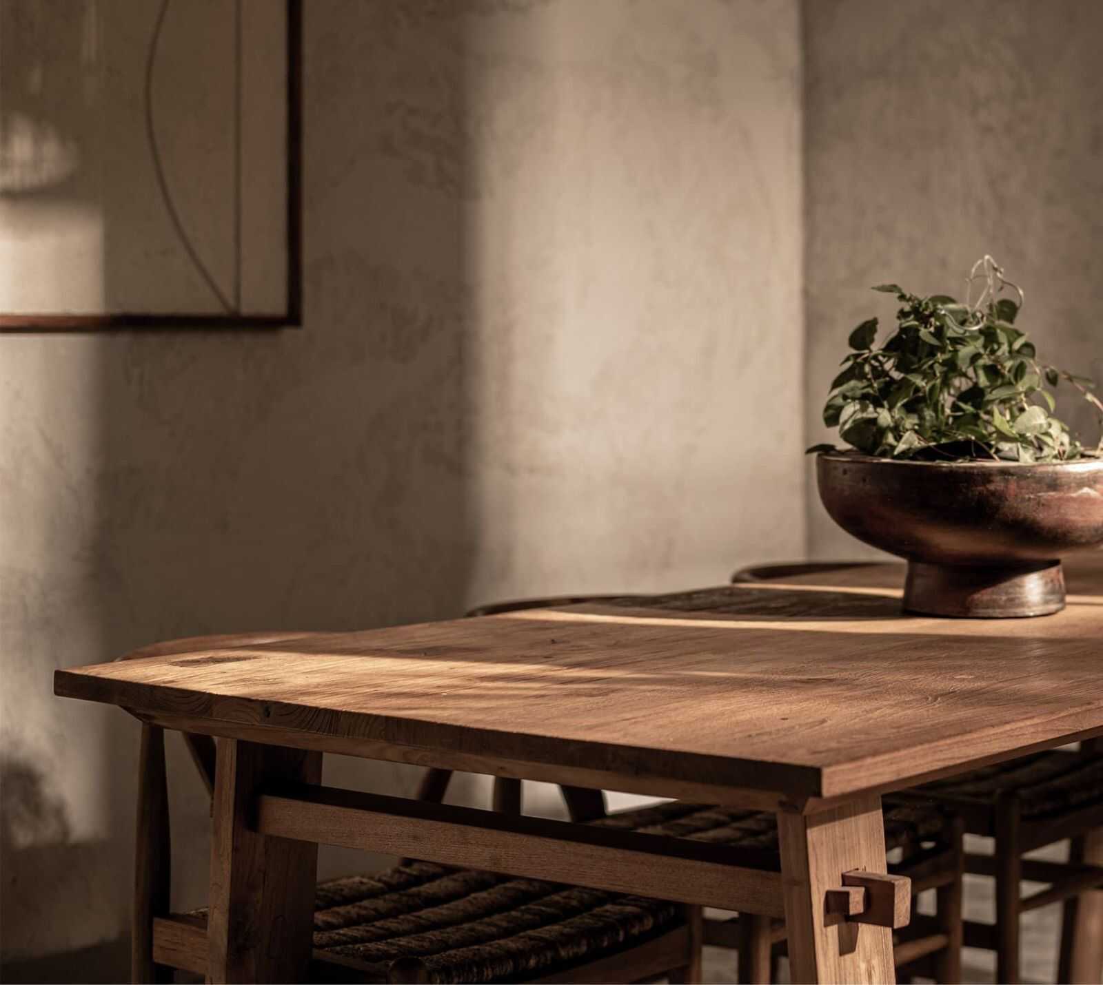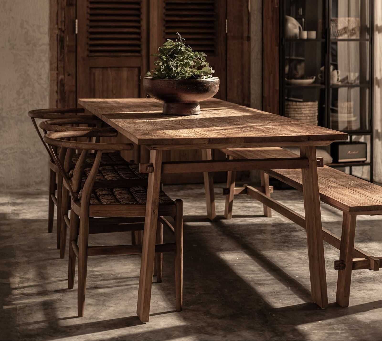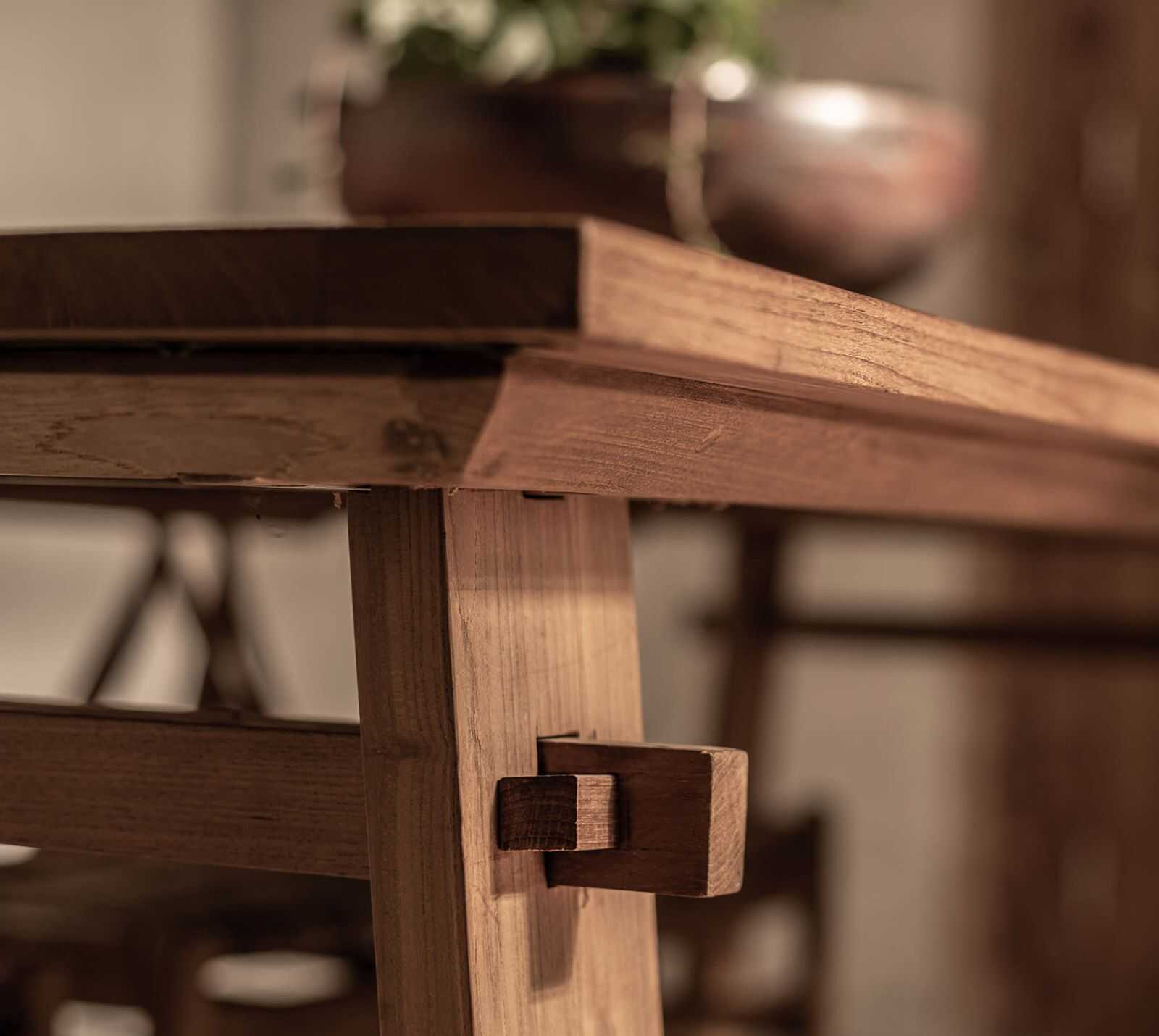 שולחן אוכל כפרי עשוי מעץ טיק מלא, בעל פרטי חיבורים מיוחדים בהשראת טכניקות נגרות מסורתיות.