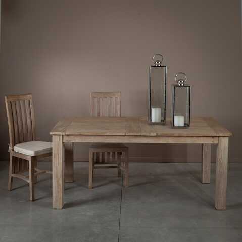 שולחן אוכל מעץ טיק מולבן עם פתיחות בסגנון כפרי