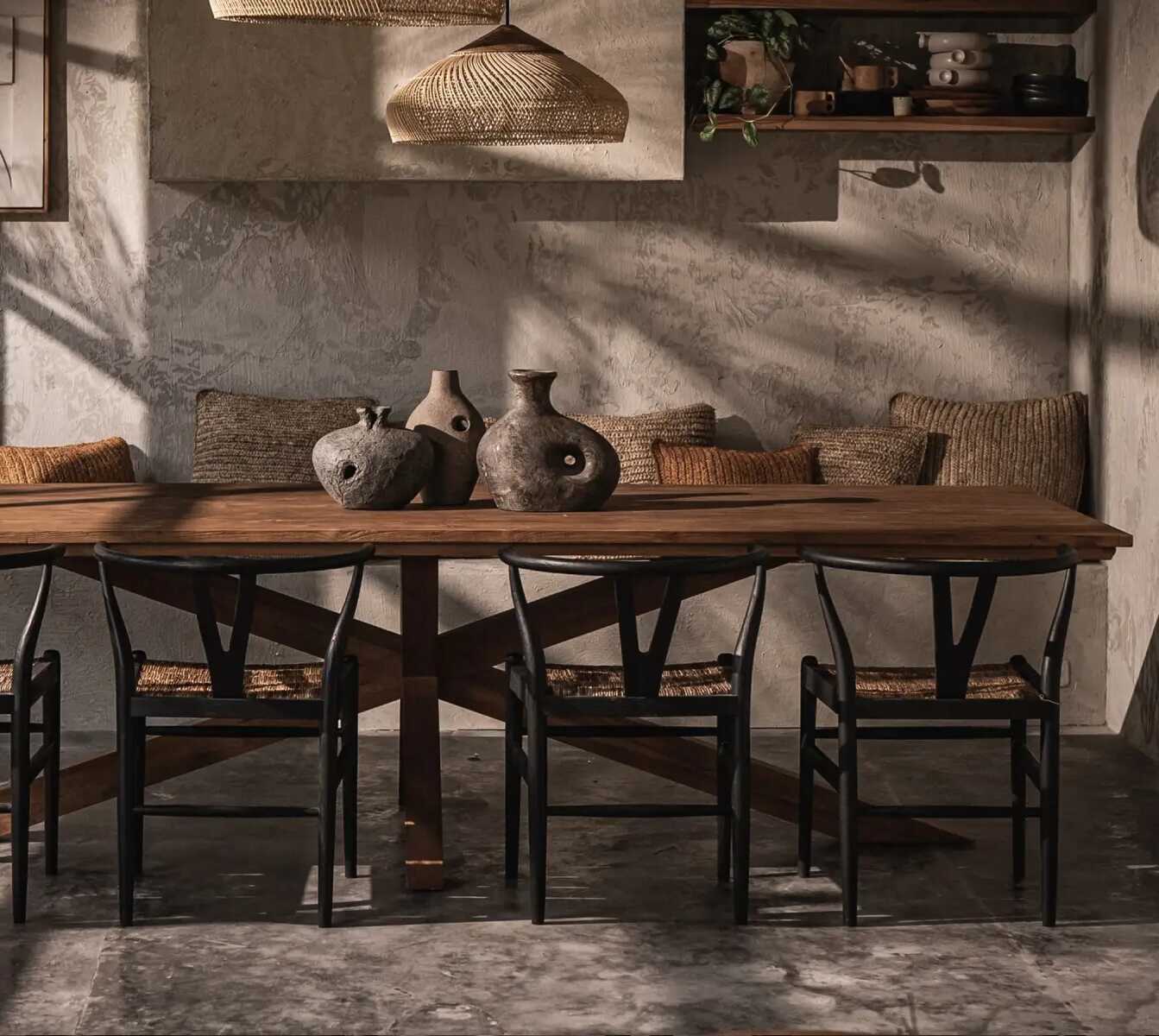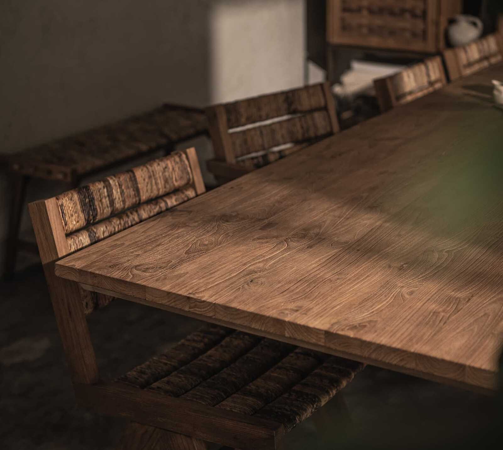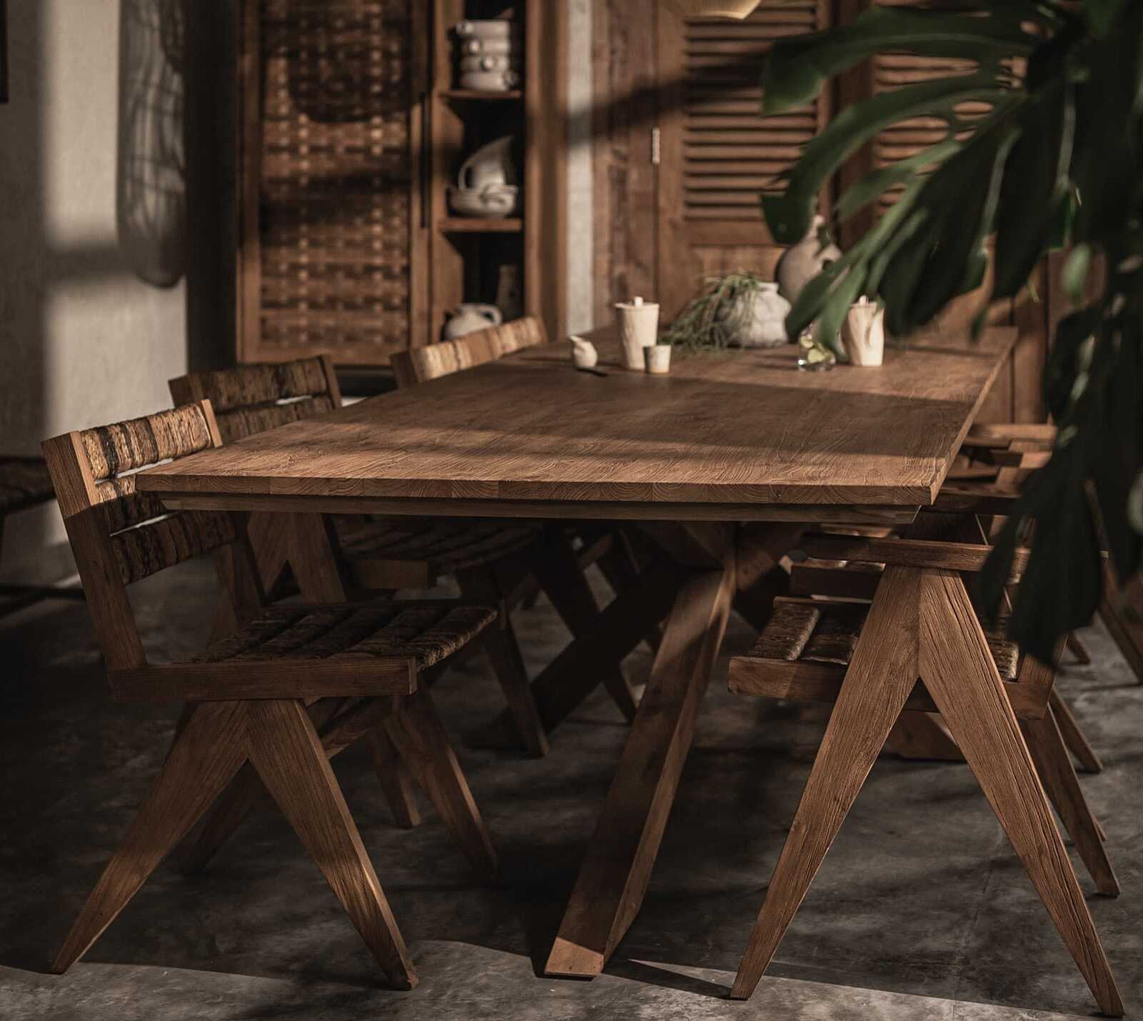 שולחן אוכל מעץ טיק מלא בעל עיצוב ייחודי עם רגליים בצורת X.