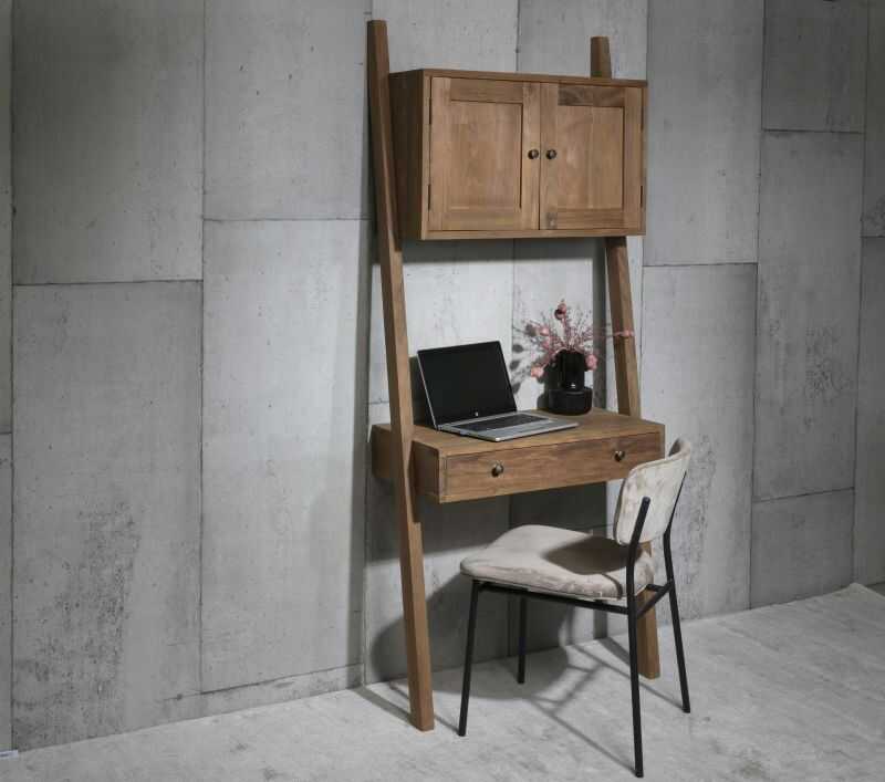 מדף עבודה קומבי, מעץ טיק מלא ממוחזר בגימור טבעי. משטח עבודה עם מגירה וארונית עליונה. נשען על קיר. ניתן לשלב עם מדפי CORDOBA,