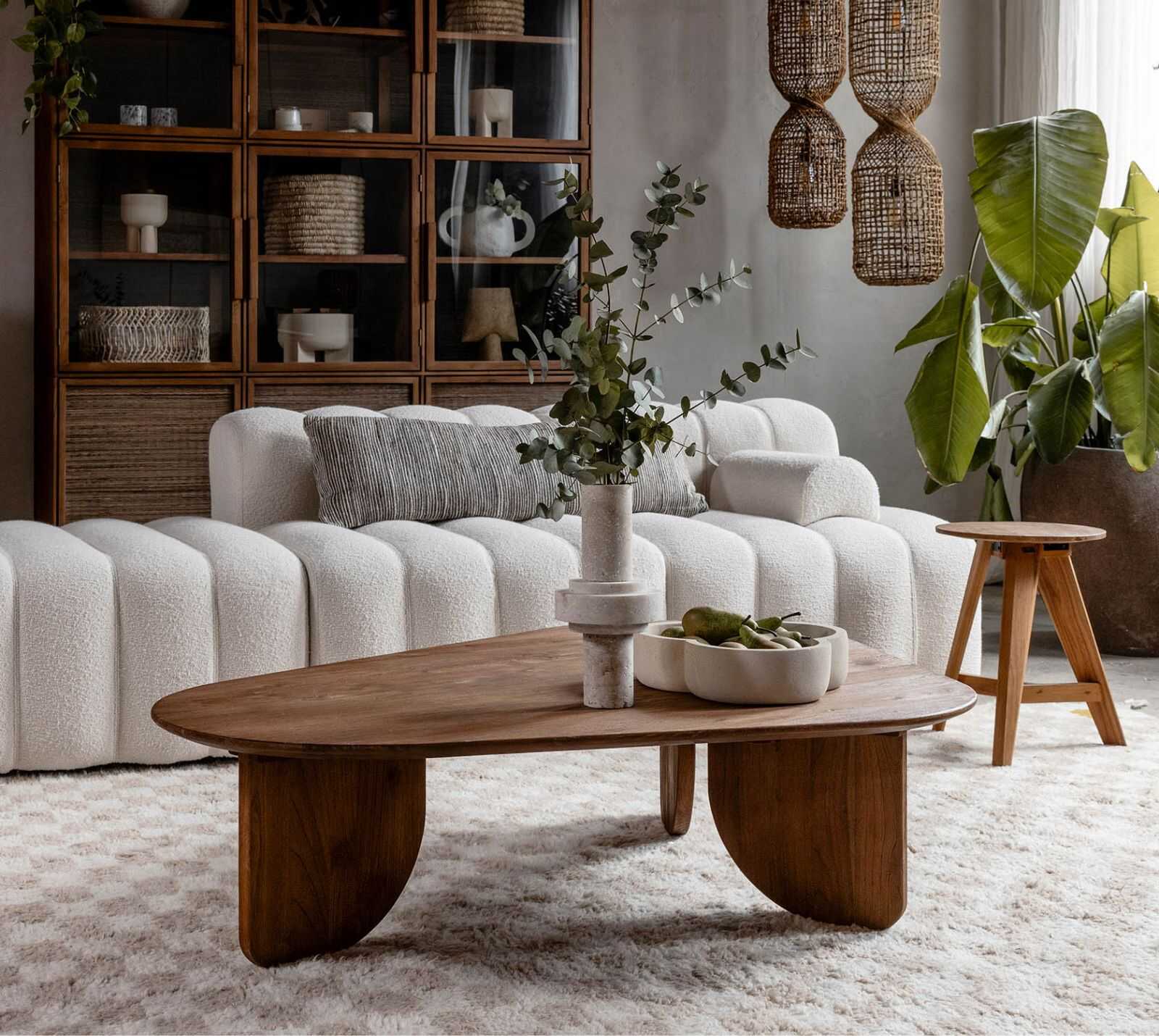 שולחן סלון מעוצב בצורת משולש עם פינות מעוגלות ורגלי חצי קשת. שולחן סלון עשוי עץ טיק מלא בגימור טבעי.