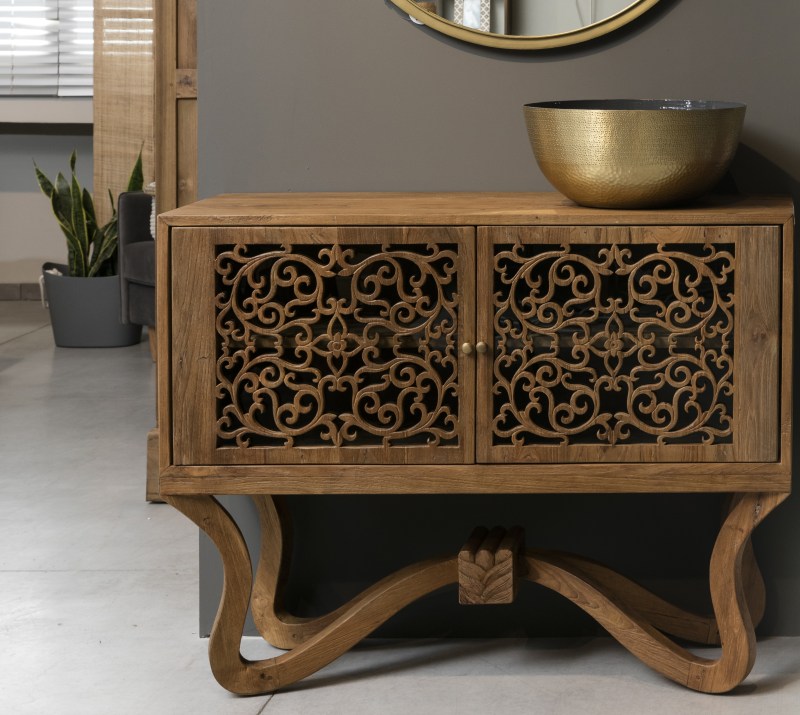 שידת עם פיתוחים . עסוי מעץ טיק ממוחזר מלא.
