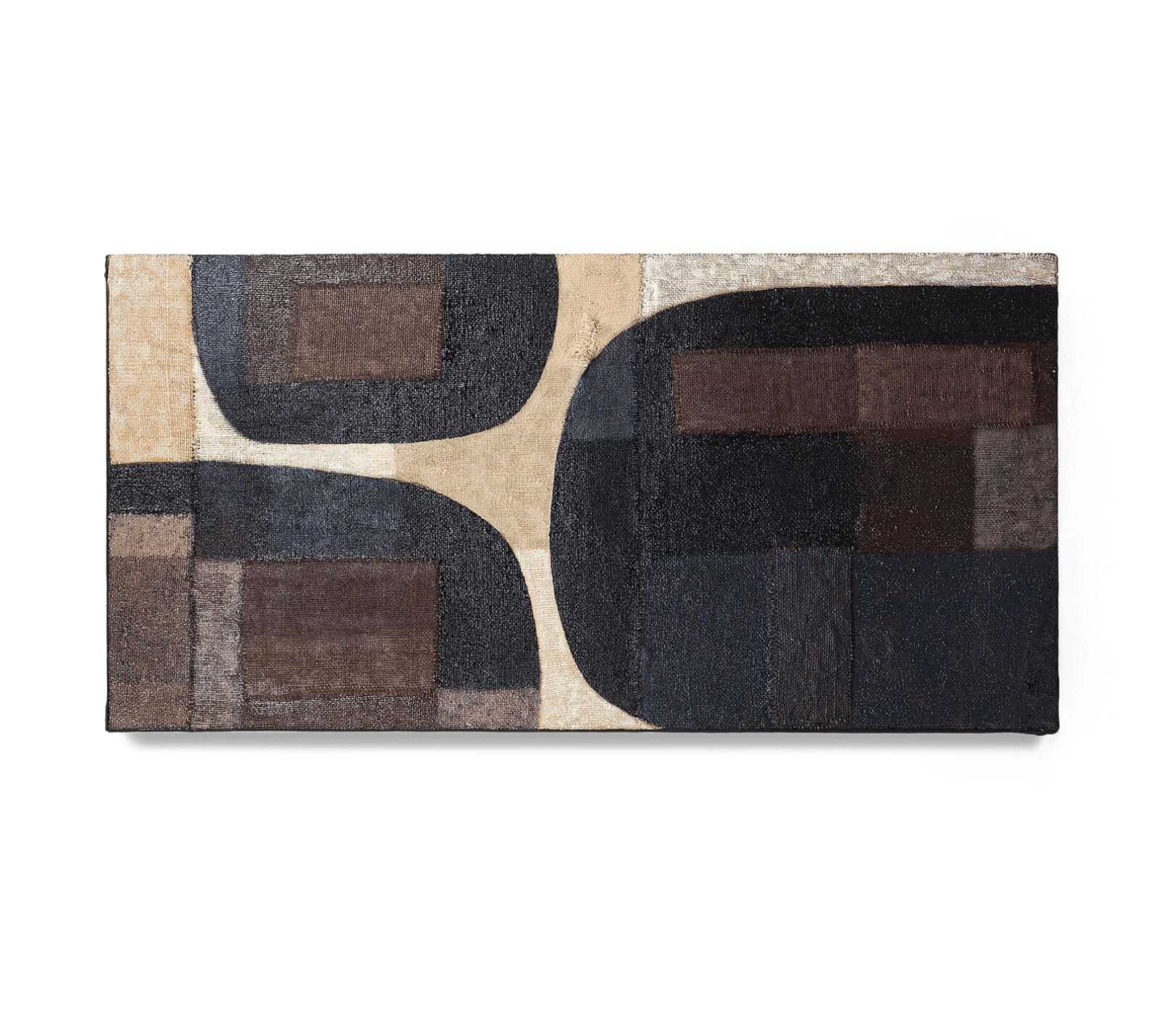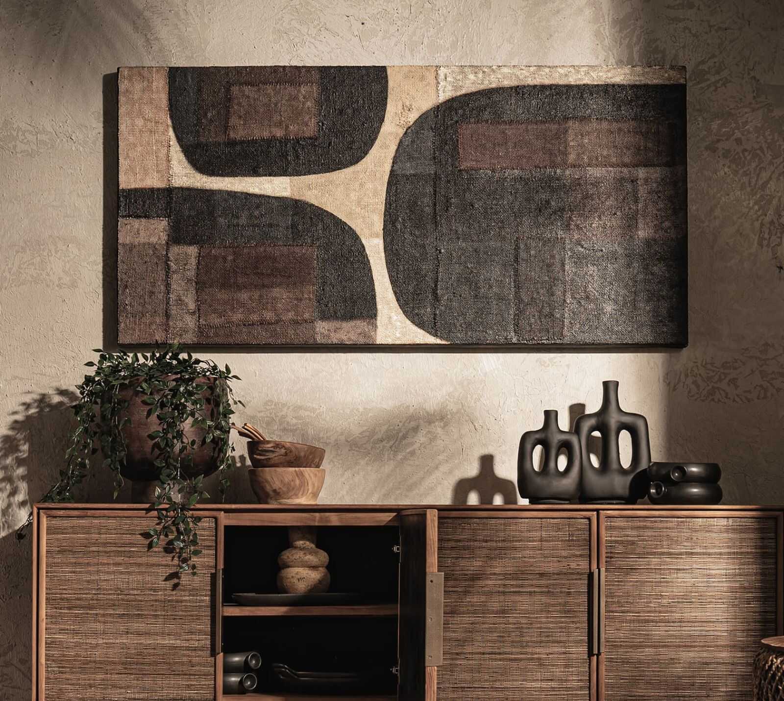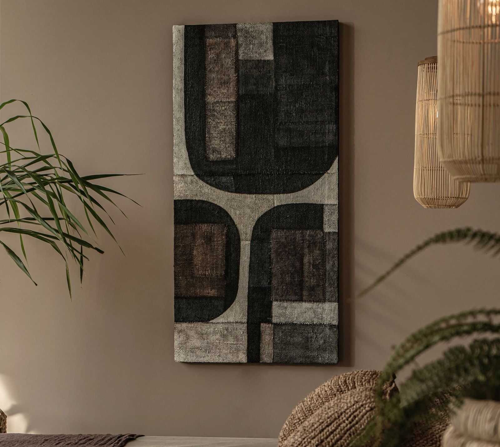 יצירת אומנות לקיר עשויה חומרים ממוחזרים על מסגרת עץ מלא, בגימור צבע על בסיס מים.