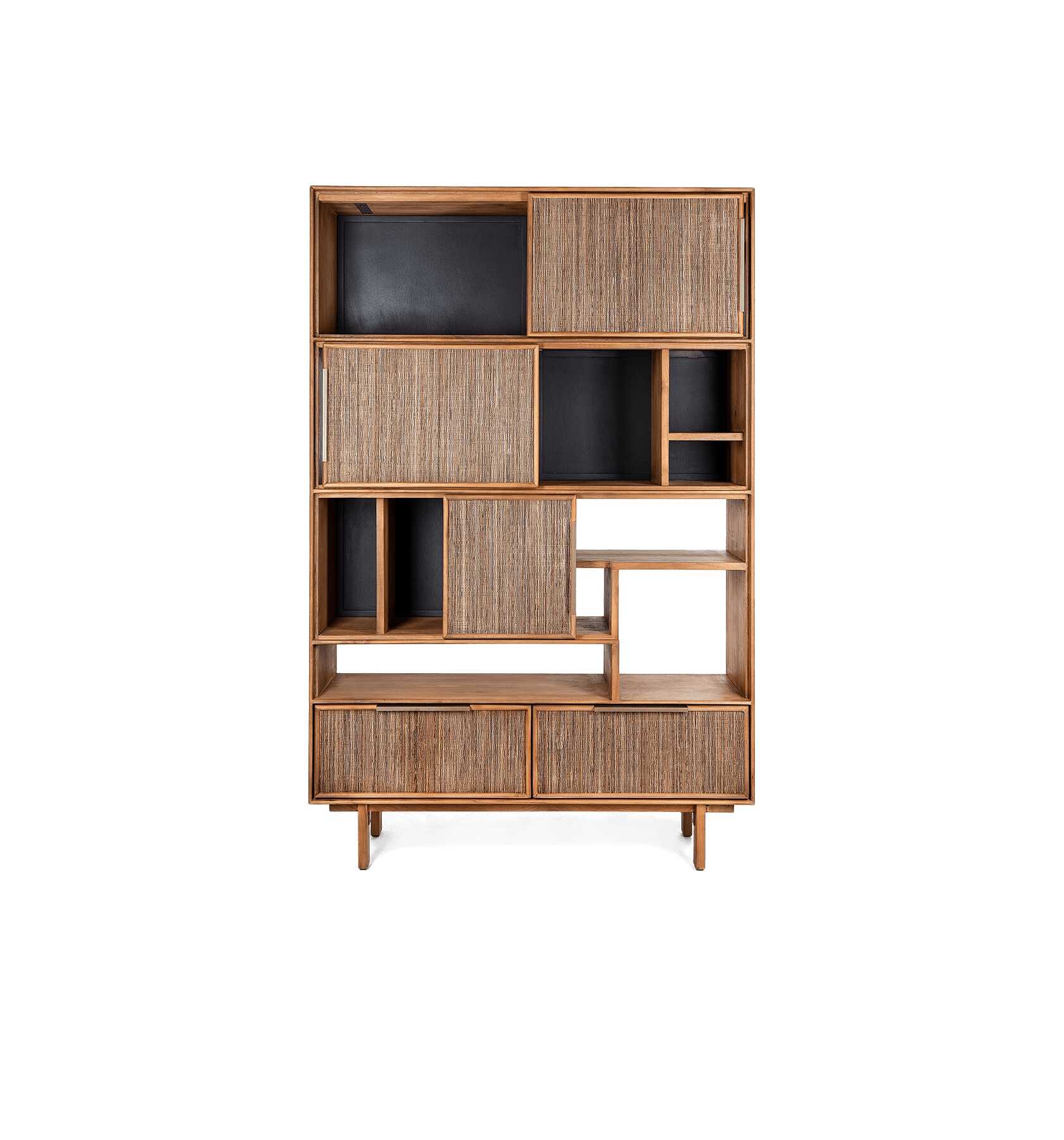 ארון מעוצב לסלון בסגנון מודרני בהשראת מונדריאן. ארון הזזה לסלון במראה רטרו, עשוי מעץ טיק ממוחזר עם דלתות הזזה וחללים פתוחים לאחסון במראה נקי.