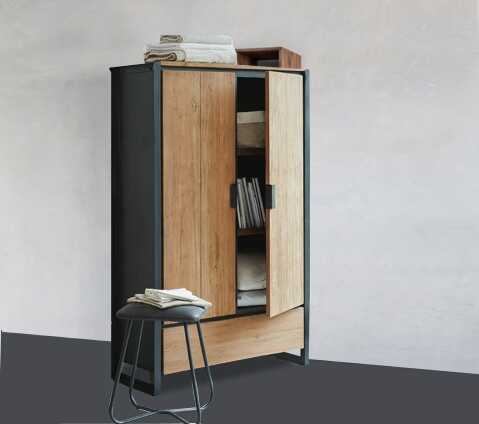 ארון בגדים מעוצב עשוי עץ מלא בגימור טבעי בשילוב עם ברזל – שילוב של כפרי ומודרני לאווירה מושלמת.