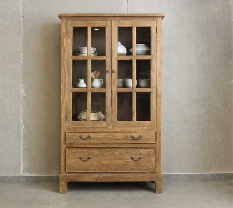 ויטרינה עם 2 דלתות ו-2 מגירות. עשוי מעץ טיק ממוחזר,סיגנון כפרי
