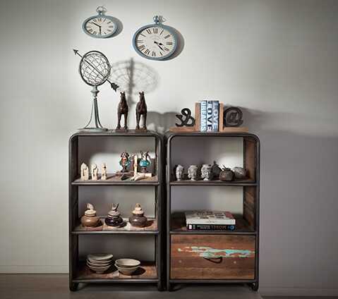 ספריה מעץ ממוחזר עם מדפים ומגירה בסגנון וינטג'