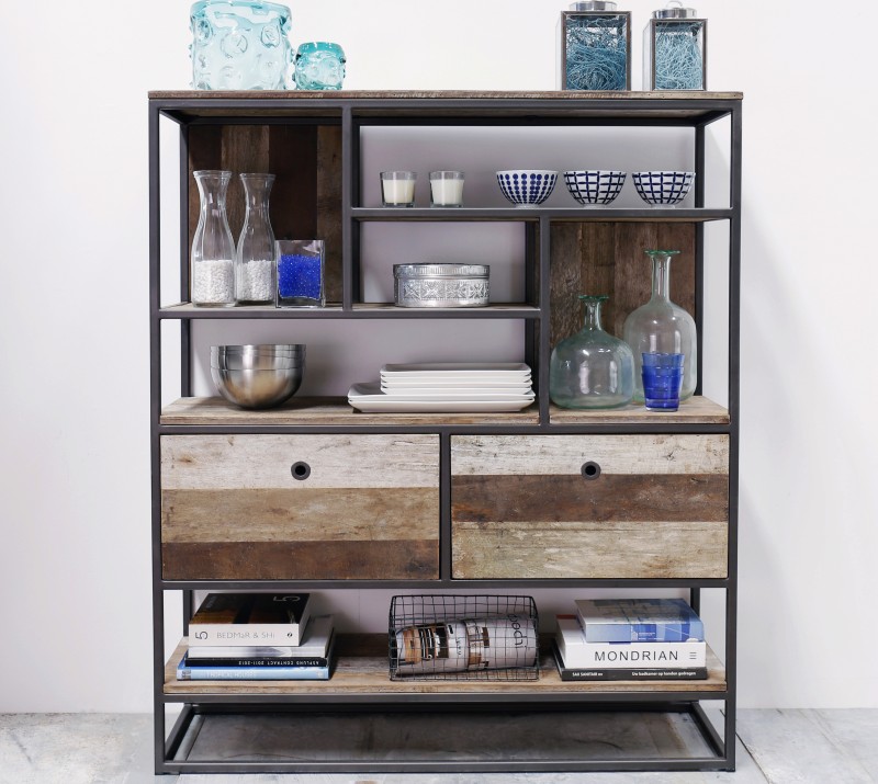 ספריה מעץ ממוחזר עם שתי מגירות ו-7 מדפים