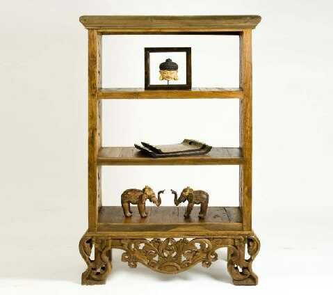 ספריית מדפים פתוחה מעץ טיק ממוחזר ומלא עם גילופים עתיקים בסגנון האי ג'אווה.