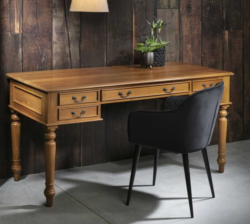 שולחן כתיבה עשוי מעץ מלא יוקרתי עם נוכחות אלגנטית. מיוצר מעץ טיק עמיד ואיכותי,המעניק לשולחן מראה חם ובעל אופי.פריט שמשלב פונקציוניליות עם עיצוב קלאסי.