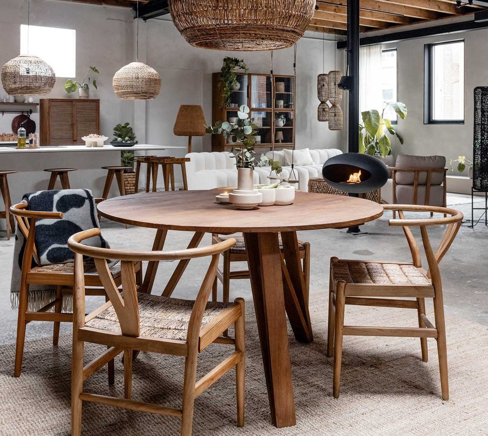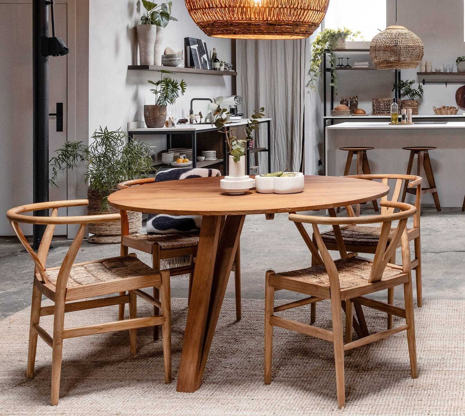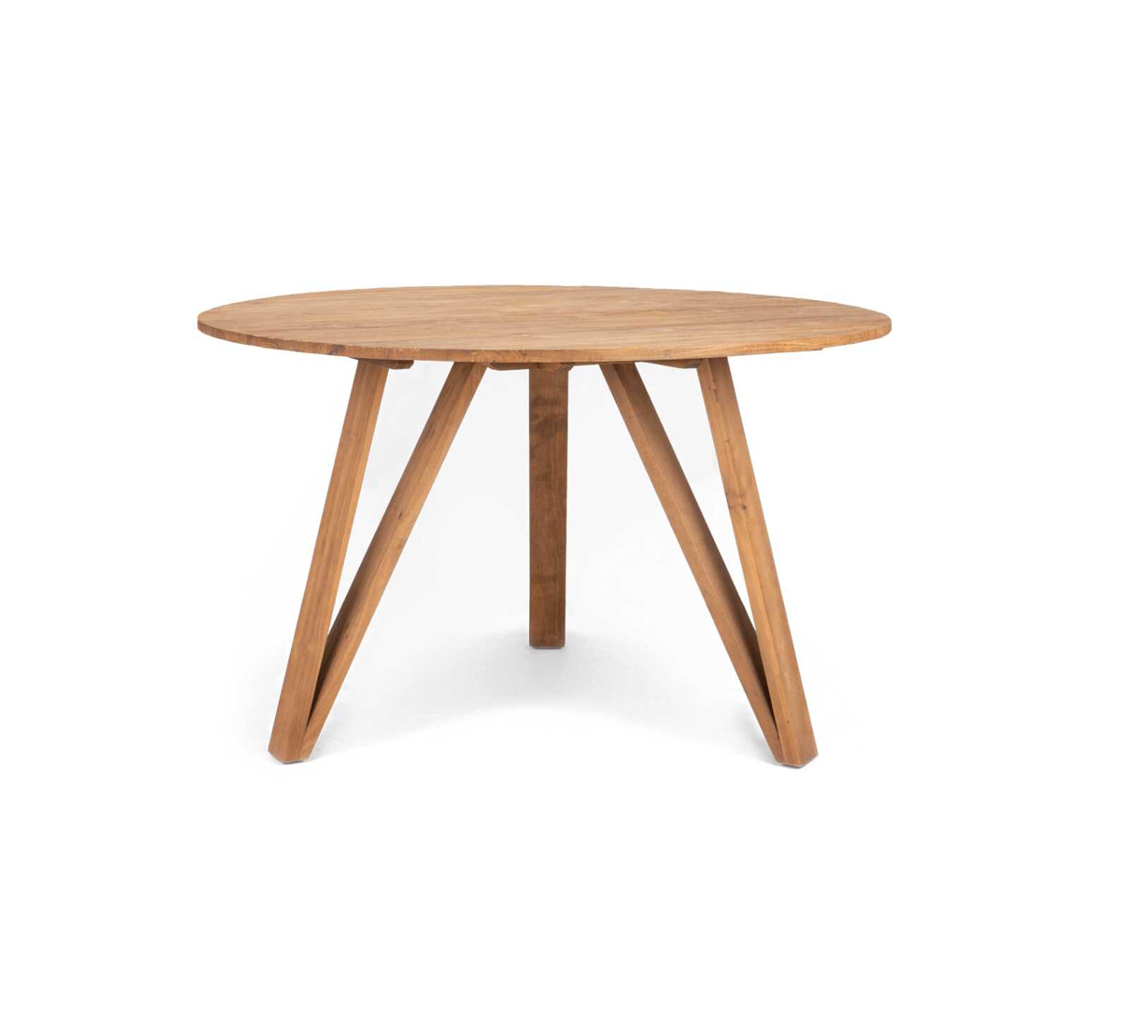 שולחן עגול לפינת אוכל במבנה אלגנטי. שולחן מעץ טיק ממוחזר מלא, מוצק ועמיד בעל עיצוב מינימליסטי מודרני.