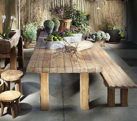 שולחן אוכל מרשים בסגנון כפרי מקורות עבות ועם ספסל תואם, מתאים לפנים או לחוץ.