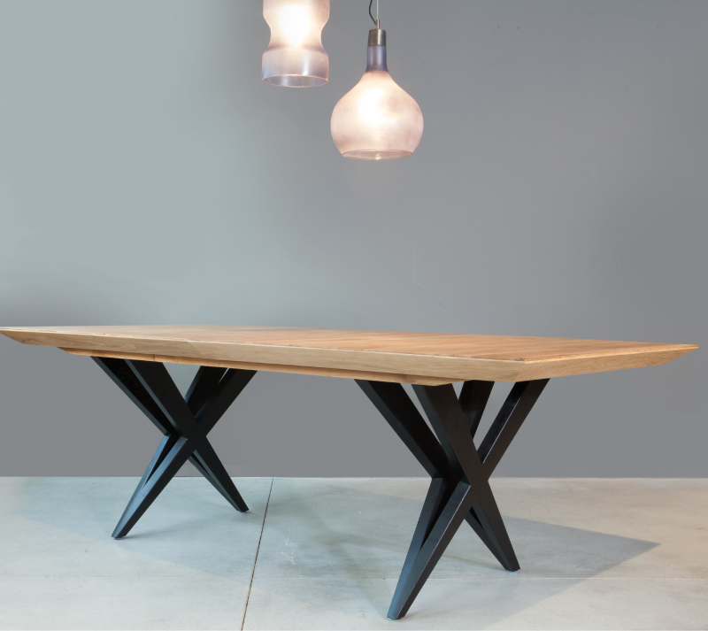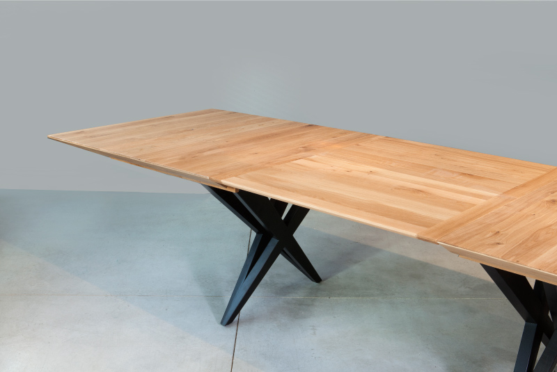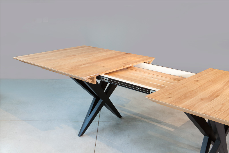 שולחן אוכל מעוצב מעץ אלון על רגליים ייחודיות ופתיחה.