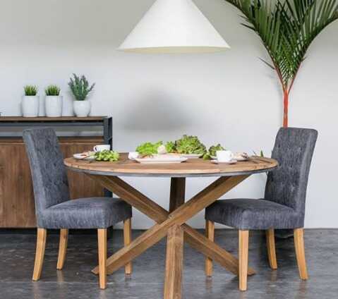 שולחן אוכל מעץ טיק ממוחזר מלא בגוון אגוז.