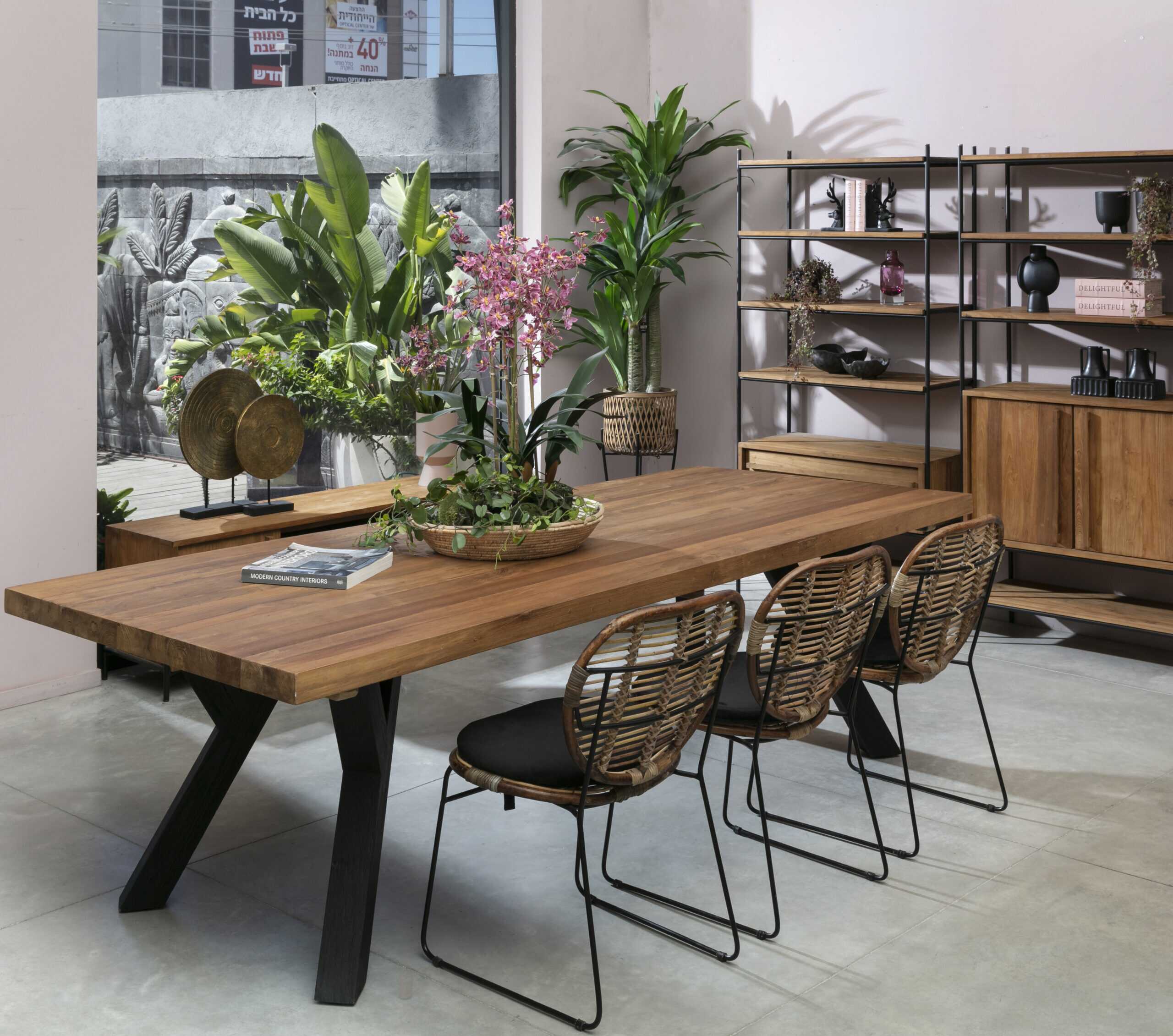 שולחן עם עיצוב ייחודי בעל רליים מיוחדות, שעשוי מעץ טיק ממוחזר. יש גם כולו בצבע טבעי
