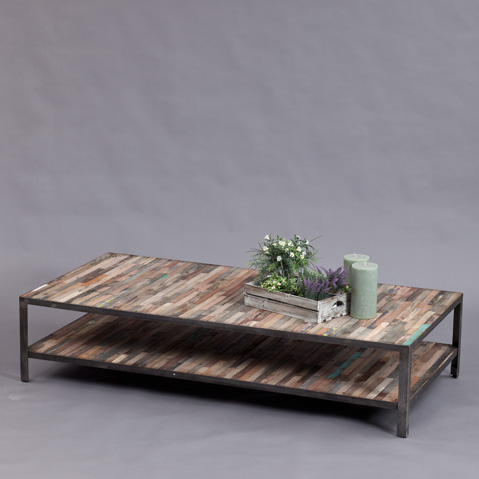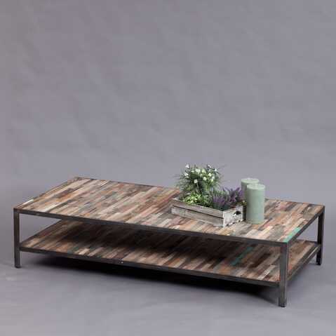 שולחן סלון ייחודי עשוי מעץ ממוחזר מסירות דיג שפורקו, נחתכו וחוברו מחדש לכדי שולחן מעוצב ומעניין בשילוב מתכת ועם מדף תחתון.