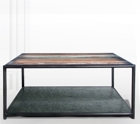 שולחן קפה לסלון מרובע עם מדף תחתון, עשוי עץ מלא ממוחזר וברזל.