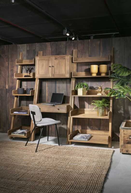 מדף עבודה קומבי, מעץ טיק מלא ממוחזר בגימור טבעי. משטח עבודה עם מגירה וארונית עליונה. נשען על קיר. ניתן לשלב עם מדפי CORDOBA,