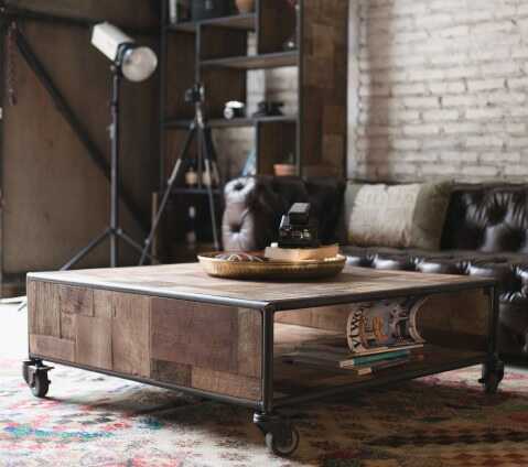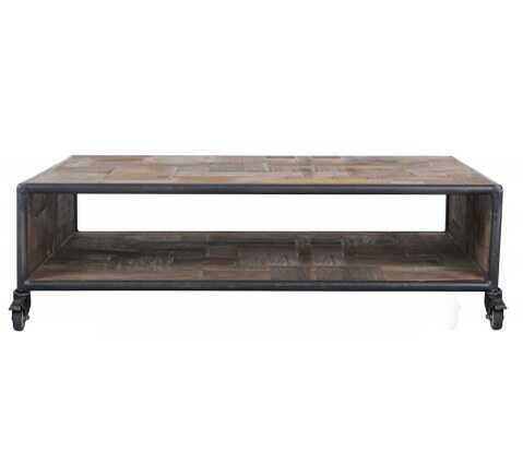 שולחן קפה מעץ טיק ממוחזר על גלגלים עם מסגרת ברזל שחורה