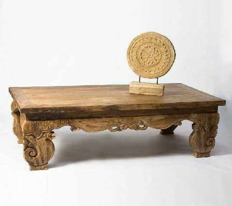 שולחן בסגנון ג'אווה מעץ טיק ממוחזר. רגלים עם פיתוחים.