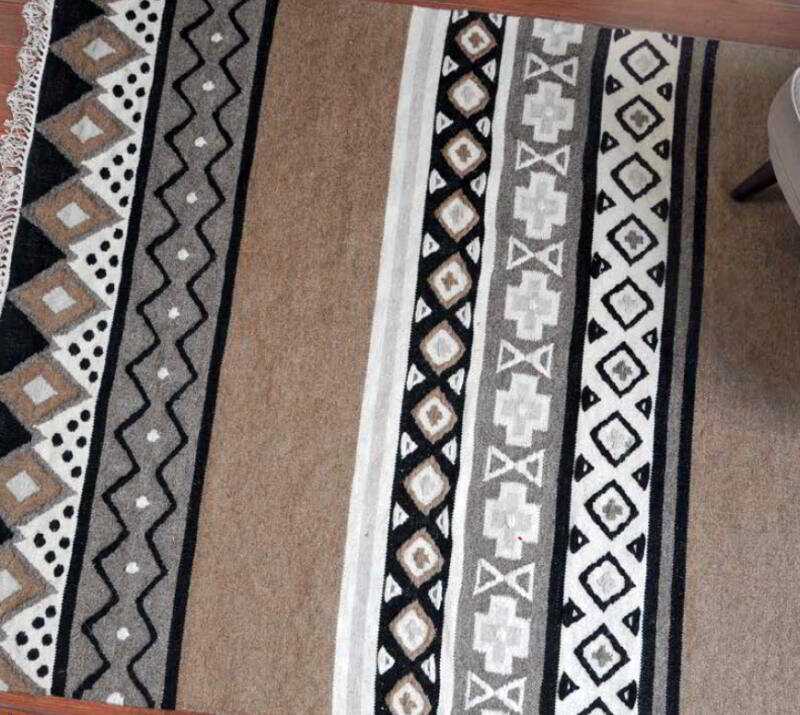 שטיח קילים ארוג בדוגמת פסים וצורות גאומטריות.