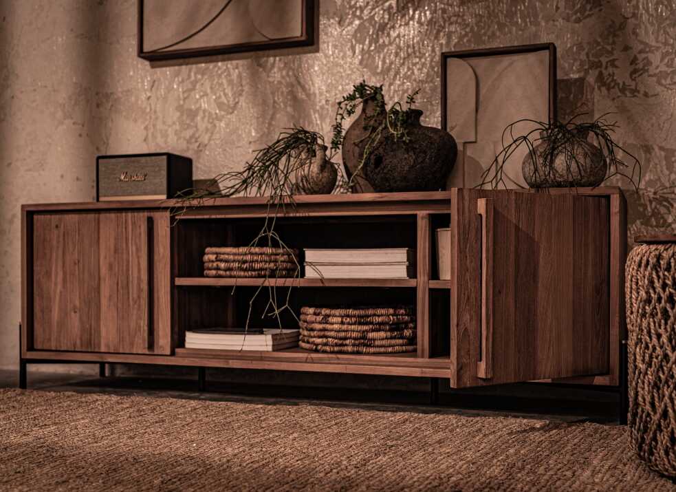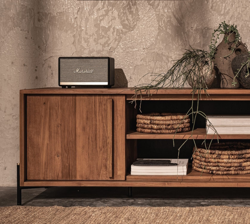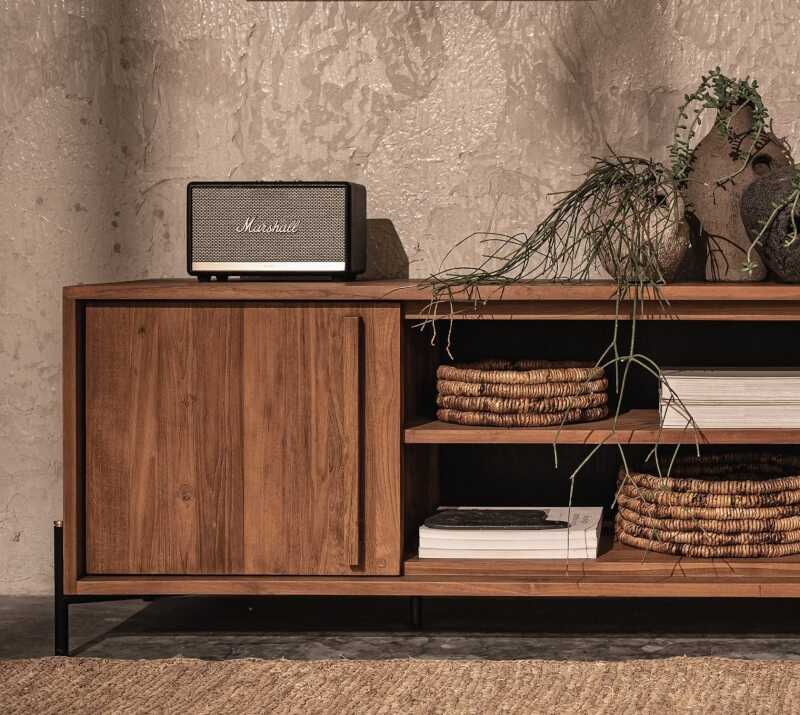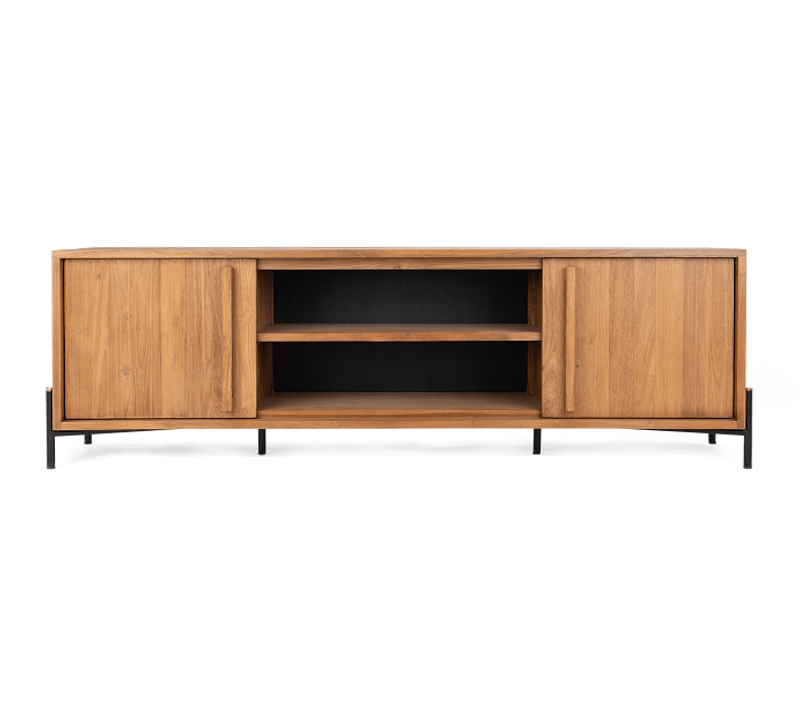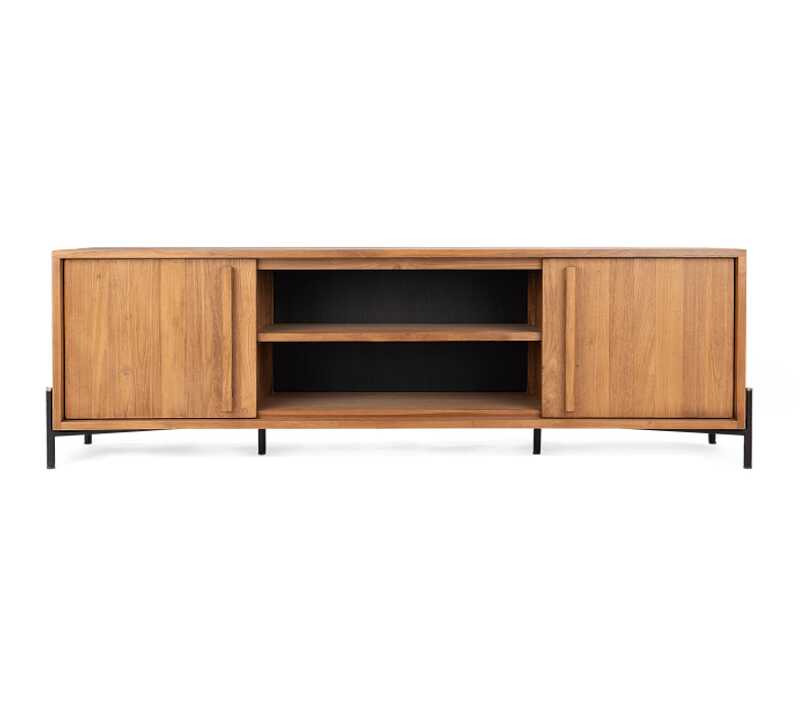 שידת טלוויזיה עדינה ואלגנטית מסדרת OUTLINE, עשויה מעץ טיק ממוחזר.