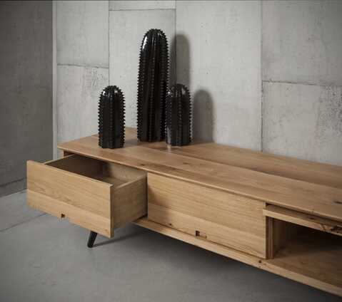 שידת טלוויזיה מעוצבת בגימור טבעי השומר על הגוונים הטבעיים של עץ אלון. ניתן להזמין לפי מידה.