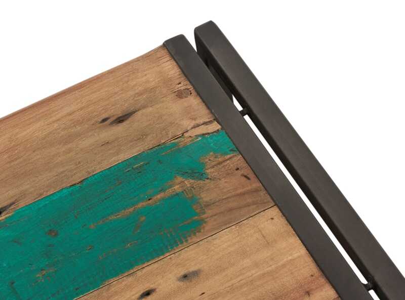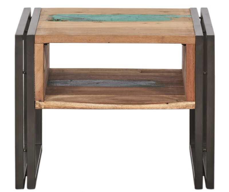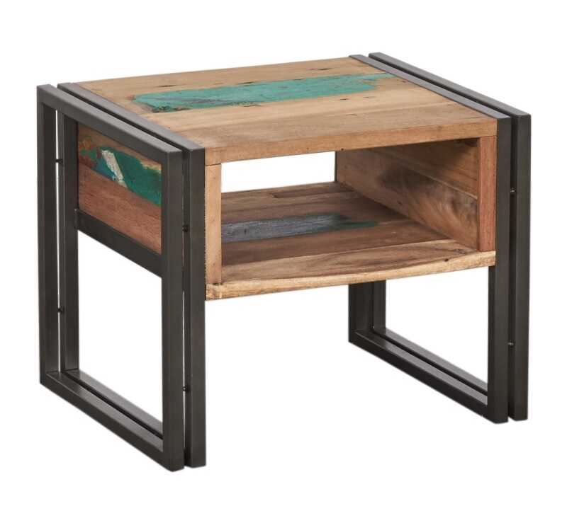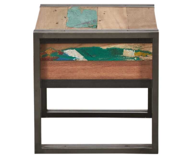 שידת לילה מעץ ממוחזר בעלת מסגרת ברזל.