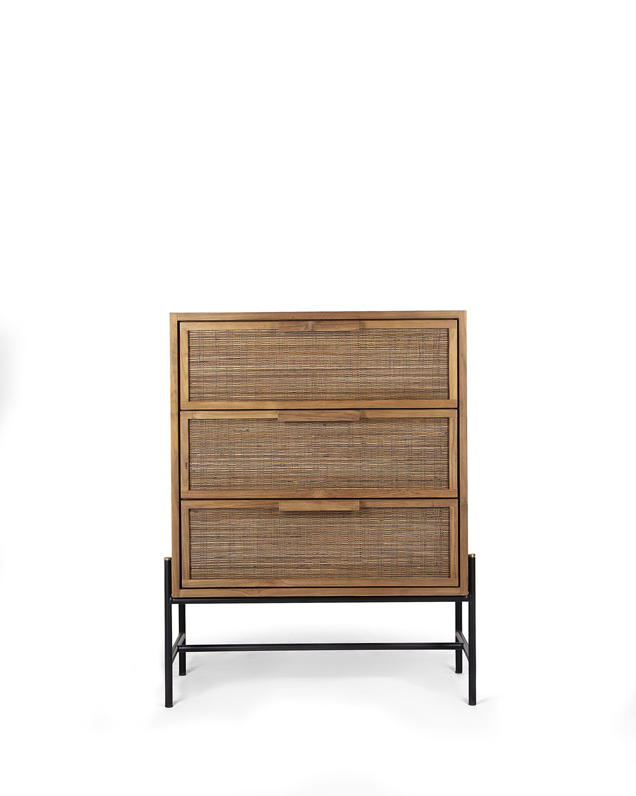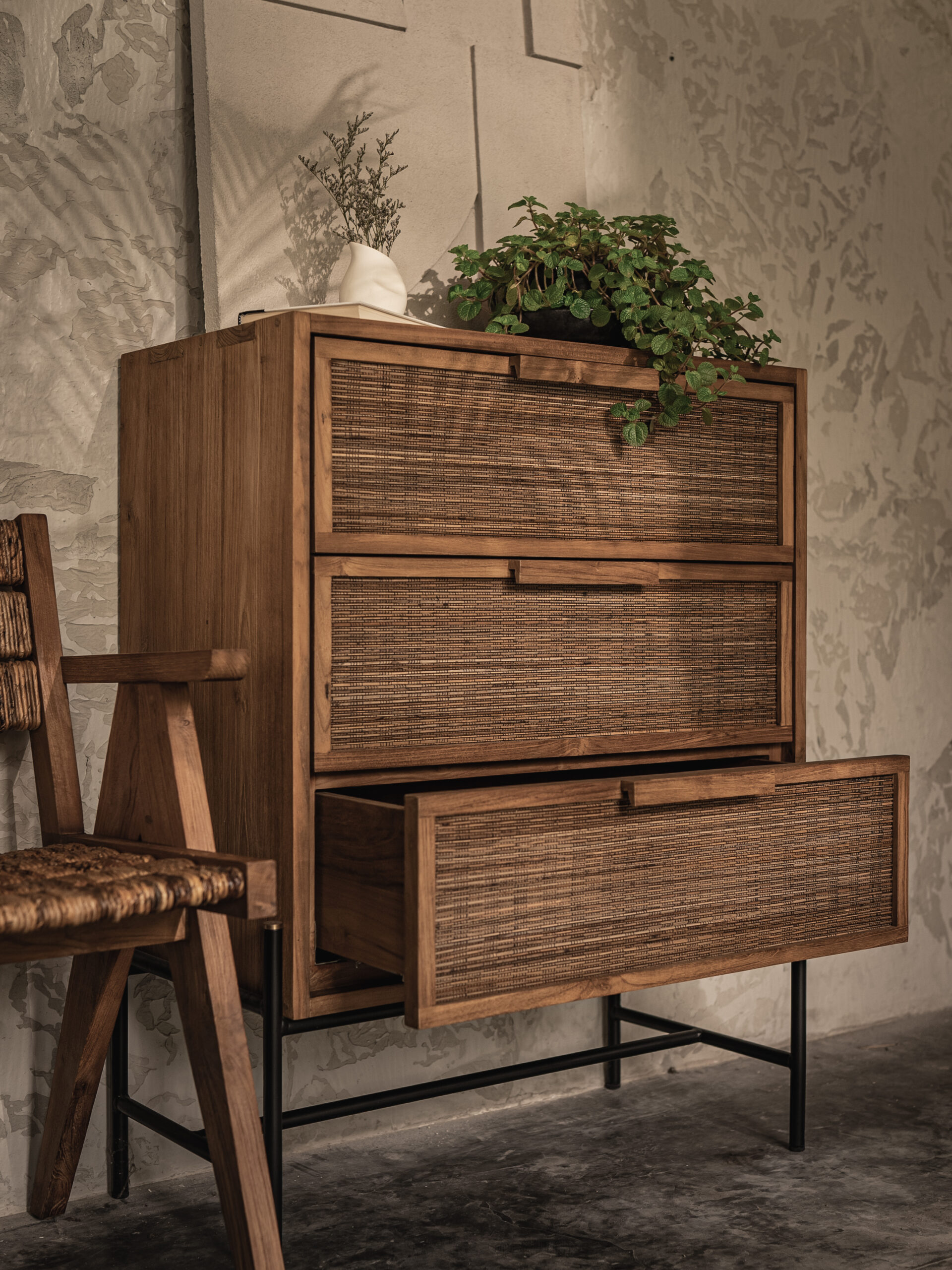 שידת מגירות מעץ טיק ממוחזר בשילוב עם קנים קלועים מעלי עץ קוקוס ורגלי ברזל.