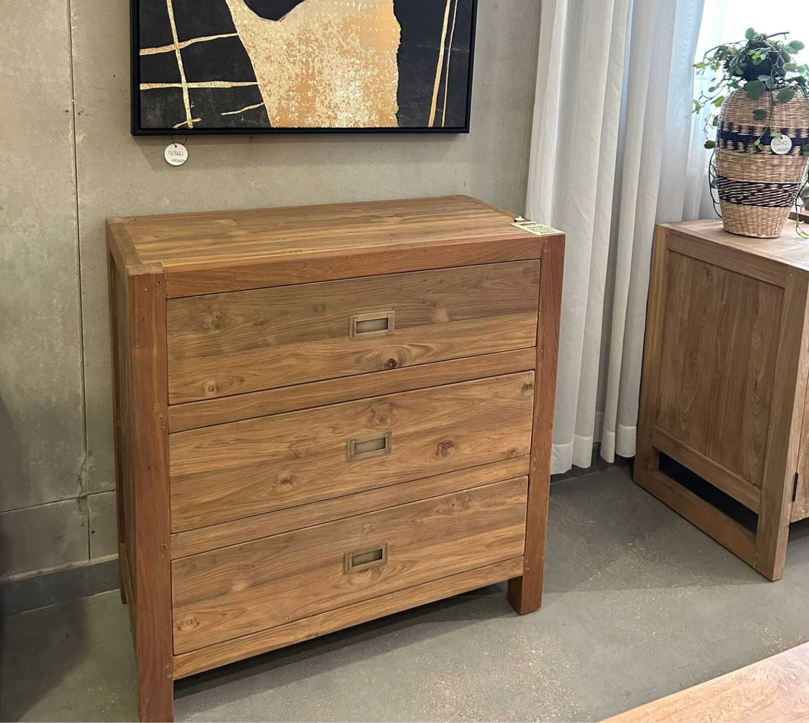 שידת עץ מלא בעלת שלוש מגירות אחסון רחבות. עשויה עץ טיק ממוחזר.