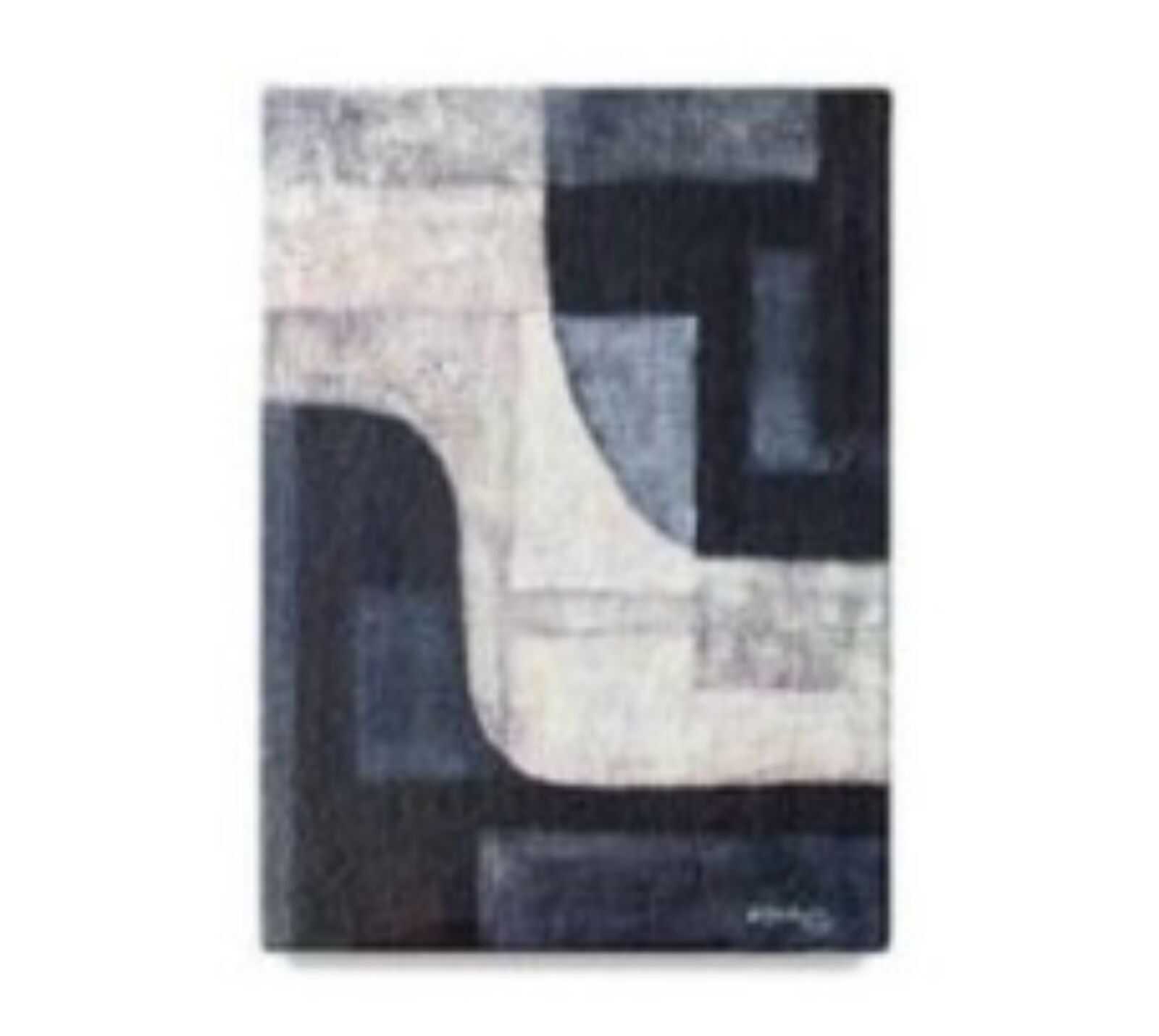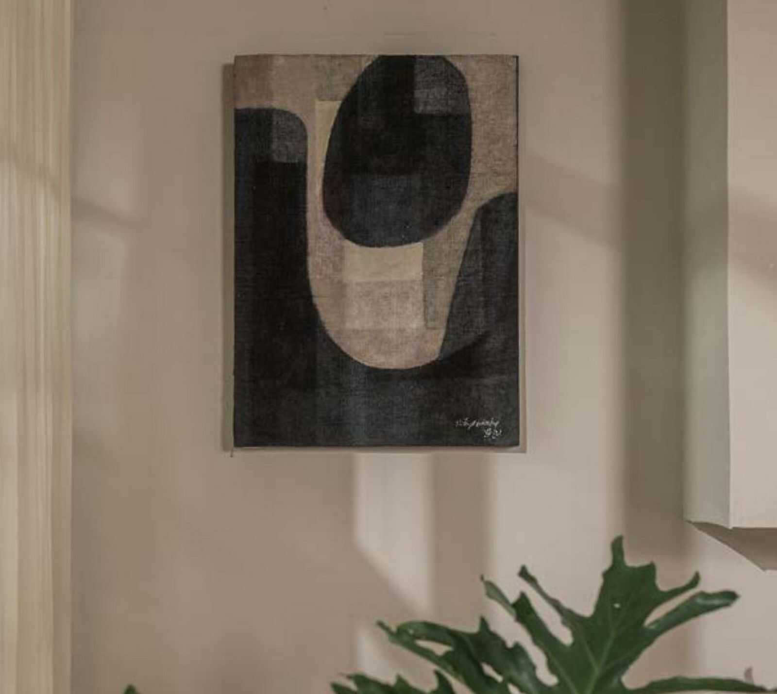 תמונה בהשראת מקורות מסורתיים מבדי יוטה ממוחזרים על מסגרת עץ מלא.