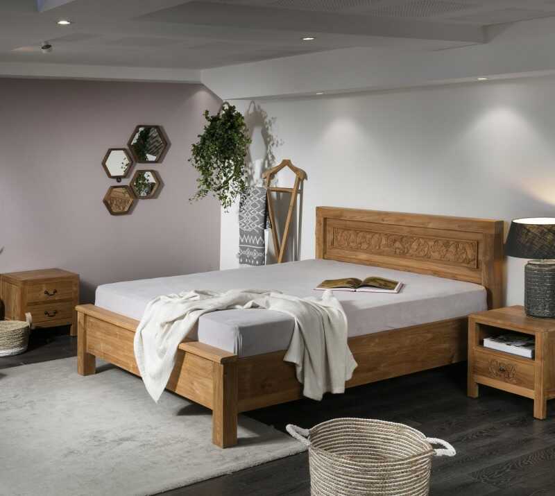 מיטה פלורל עשוי מעץ טיק עם גילופים של פרחים על הגב בעבודת יד!